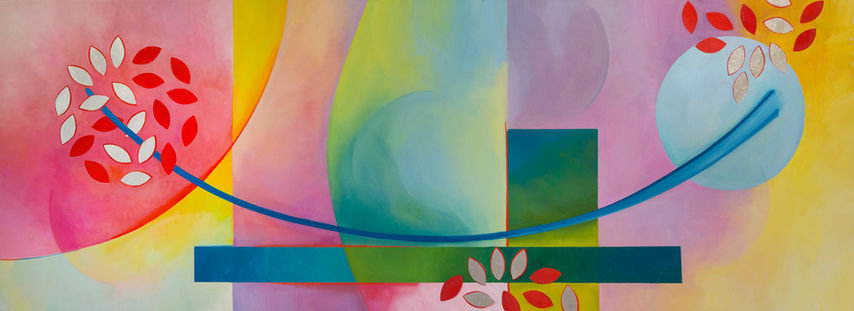 The icons in my paintings- the curved line, the oval or egg shape, the dots and the leaf like shape – arrived out of the process of painting for most of my sixty-six years. I like to think that the images are born out of the Jungian collective unconscious. This idea of a vast, timeless pool of thoughts, memories and ideas, which all beings dip into and contribute to, has been made apparent to me in numerous ways. The egg or oval shape, which is a metaphor for creation, has been a major element in my work for thirty years. Most recently this form has transmuted into the seed, and the dot or circle, which are also perhaps more obvious symbols for creation. Presently I am working on both canvas and cradle board and exploring new materials. Sometimes I create drawings and enlarge them onto the support. At other times, and most often when I am working on cradleboard, I will work more spontaneously. Layering spray paint, acrylic, oils and silver leaf provide an exciting adventure for me. My work is marked by a profusion of soft curves and geometric shapes executed in deeply saturated color. I hope you enjoy viewing my work as much as I have loved making it!